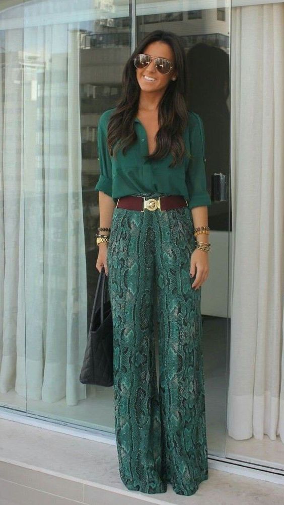 Pour une allure travaillée au travail, le palazzo fait des merveilles. Optez pour un pantalon fluide uni ou dans une teinte sobre, à associer à une blouse en soie et une paire d’escarpins ou de mocassins. Le look monochrome fonctionne très bien, surtout avec une ceinture tendance pour souligner la taille. Côté accessoires, restez minimaliste : un ou deux bijoux discrets, un maquillage léger, et le tour est joué.