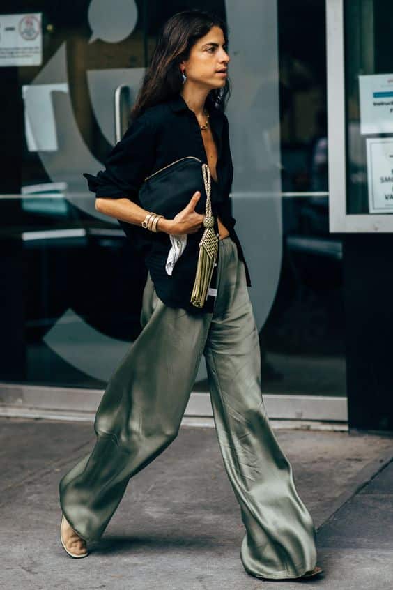 Le palazzo se prête parfaitement aux occasions habillées. Il suffit de choisir une version sombre ou brillante, en satin ou en cupro par exemple, et de l’associer à un body ajusté avec un joli décolleté dans le dos. Ajoutez des talons, une ceinture fine, une pochette élégante, quelques bijoux, et pourquoi pas un maquillage plus appuyé, œil charbonneux ou lèvres rouges. L’ensemble prend alors une dimension ultra-glamour.